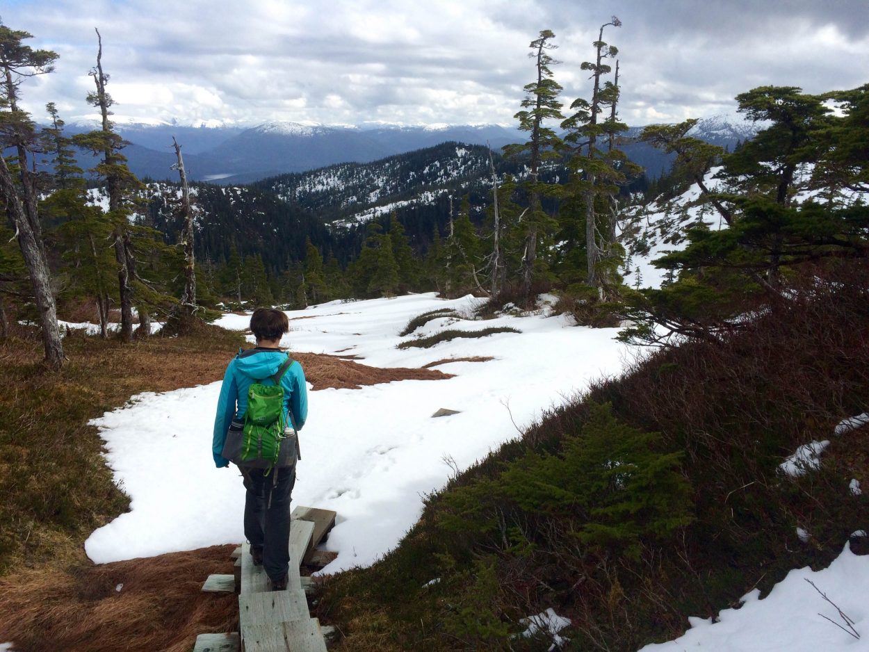 A hiker takes on a snowy trail in the Wrangell Ranger District of the Tongass National Forest. Southeast Alaska business-owners affiliated with the visitor industry worry recreation funding is declining too quickly to maintain trails and cabins on the Tongass. (Katarina Sostaric/KSTK)