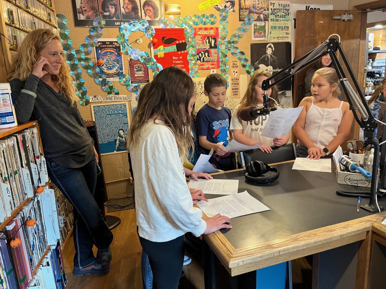 Wrangell third graders from Evergreen Elementary gathered around two microphones in KSTK’s studio to sing Alaska Flag and the Wrangell Song to celebrate Alaska Day, which is Oct. 18. Music teacher Tasha Morse accompanied the students with her guitar. They’ve been practicing for the past two weeks, but this has been a Wrangell tradition for at least 25 years.
