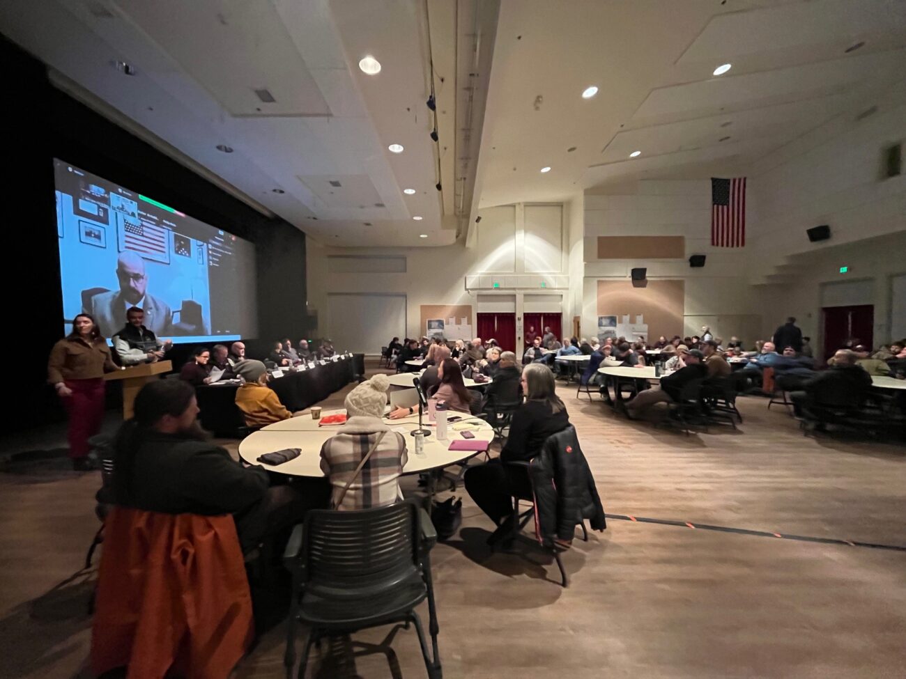 More than 100 community members fill the Nolan Center’s (Wrangell’s civic center’s) main gathering room, chattering before Thursday’s town hall meeting.